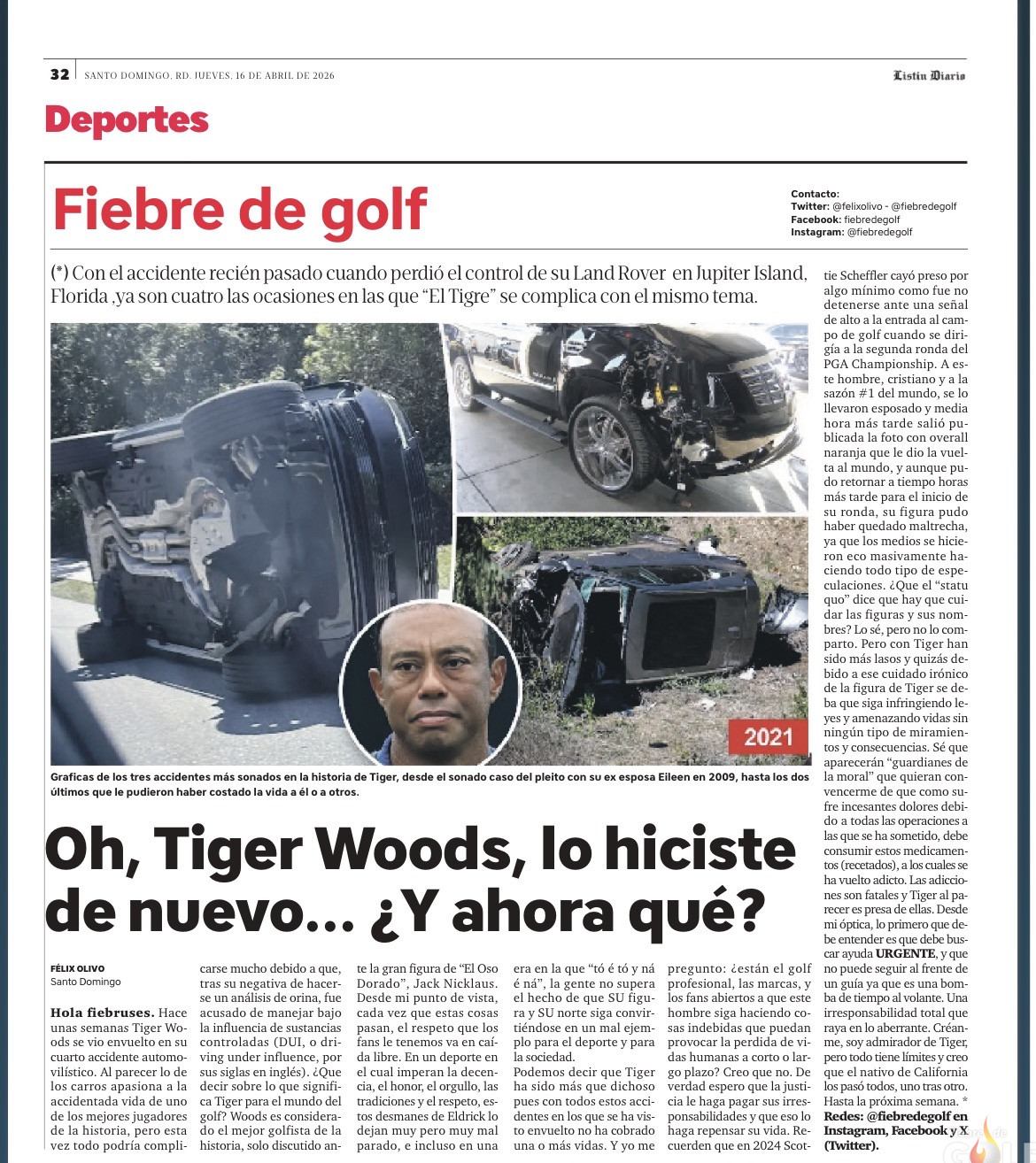 Hola Fiebruses. Hace unas semanas Tiger Woods se vio envuelto en su cuarto accidente automovilístico. Al parecer lo de los carros apasiona a la accidentada vida de uno de los mejores jugadores de la historia, pero esta vez todo podría complicarse mucho debido a que, tras su negativa de hacerse un análisis de orina, fue acusado de manejar bajo la influencia de sustancias controladas (DUI, o driving under influence, por sus siglas en inglés). ¿Que decir sobre lo que significa Tiger para el mundo del golf? Woods es considerado el mejor golfista de la historia, solo discutido ante la gran figura de “El Oso Dorado”, Jack Nicklaus. Desde mi punto de vista, cada vez que estas cosas pasan, el respeto que los fans le tenemos va en caída libre. En un deporte en el cual imperan la decencia, el honor, el orgullo, las tradiciones y el respeto, estos desmanes de Eldrick lo dejan muy pero muy mal parado, e incluso en una era en la que “tó é tó y ná é ná”, la gente no supera el hecho de que SU figura y SU norte siga convirtiéndose en un mal ejemplo para el deporte y para la sociedad.