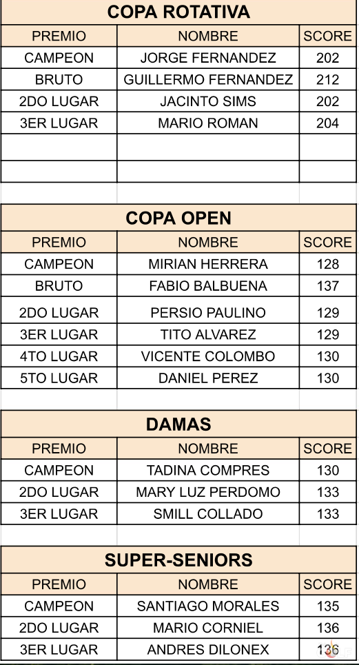 Otros ganadores del evento fueron Tadina Comprés en la rama femenina con un total de 130 golpes netos, asi como Santiago Morales , que con 135 dominó la Super Senior.