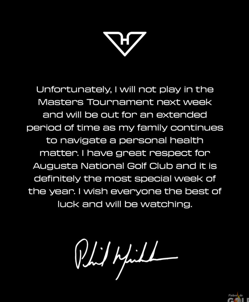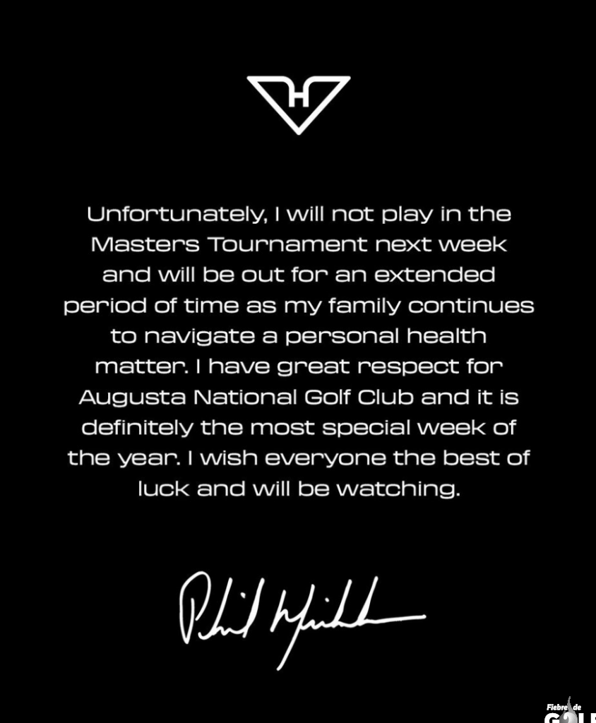 Phil Mickelson anunció que no jugará en el Masters de la próxima semana y que estará fuera por un período prolongado mientras su familia continúa «atravesando un asunto de salud personal».